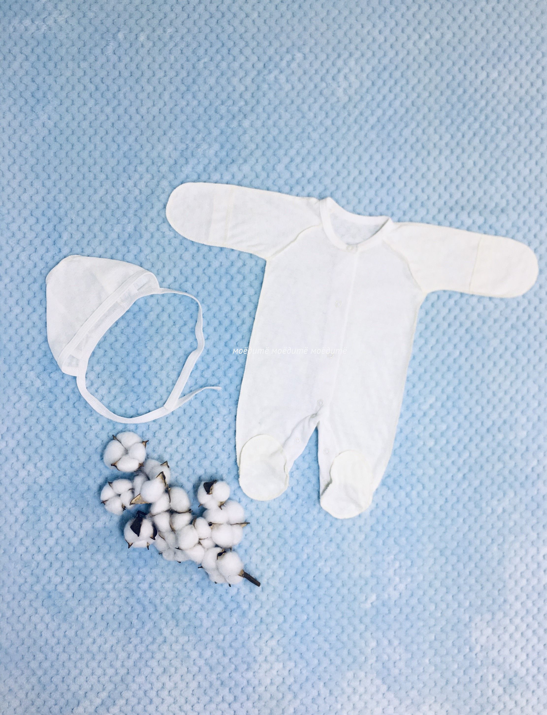 В комплект входит: удобный комбинезончик на кнопочках спереди и между ножек, чепчик на завязках.